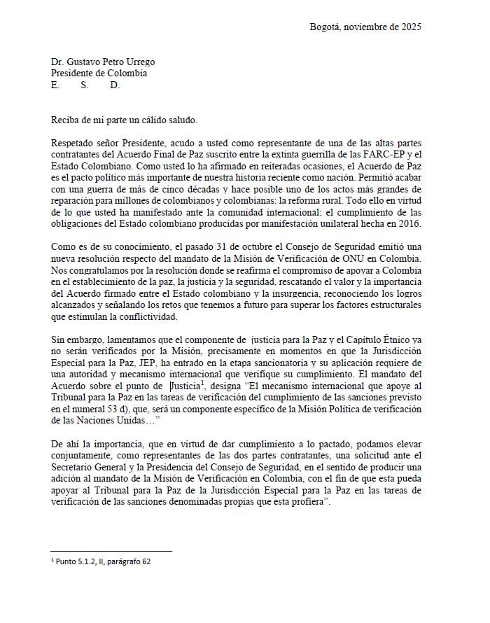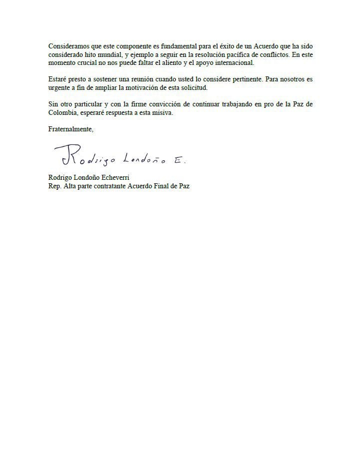 El presidente del Partido Comunes y representante de la alta parte contratante del Acuerdo Final de Paz, Rodrigo Londoño Echeverri, envió una carta al presidente Gustavo Petro solicitando que el Gobierno eleve conjuntamente una petición ante el Secretario General y el Consejo de Seguridad de la ONU. El objetivo, según explicó, es que se amplíe el mandato de la Misión de Verificación en Colombia para incluir la supervisión de las sanciones propias impuestas por la Jurisdicción Especial para la Paz (JEP).