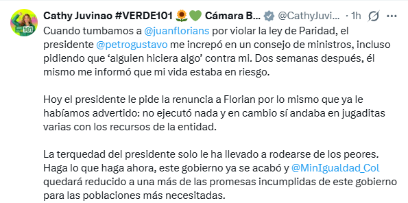 La congresista Catherine Juvinao, de la Alianza Verde, aseguró que la salida del titular responde a advertencias previas sobre la gestión de la cartera y al manejo de sus recursos. Sus declaraciones se suman a críticas que el Ministerio de la Igualdad ha recibido desde el Congreso y otros espacios de control político.