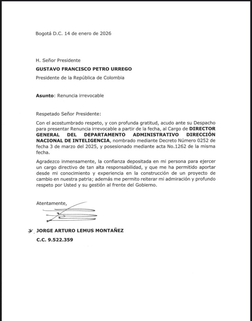 El presidente Petro solicitó la renuncia de Lemus, quien se desempeñaba como director desde marzo de 2025. La decisión se conoce en el contexto de reacomodos en el alto gobierno, en coincidencia con la salida de Angie Rodríguez como directora del Departamento Administrativo de la Presidencia (Dapre) este martes 13 de enero.