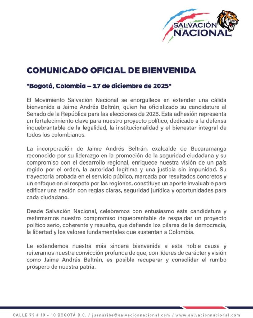 A través de un comunicado oficial, Salvación Nacional expresó que extiende su bienvenida al exalcalde de Bucaramanga y señaló que su aval hace parte del proceso de consolidación de su plataforma electoral. En el mismo pronunciamiento, el movimiento político resaltó aspectos de la trayectoria de Beltrán en el servicio público, en particular su paso por la administración municipal.