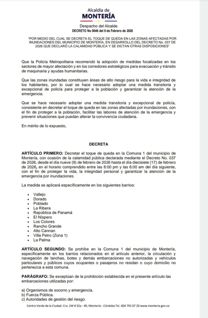La Alcaldía de Montería mantiene vigente un decreto de toque de queda en 11 sectores de la Comuna 1, en la margen occidental del municipio, como parte de las medidas adoptadas tras las inundaciones que obligaron a la evacuación de viviendas y la declaratoria de calamidad pública.