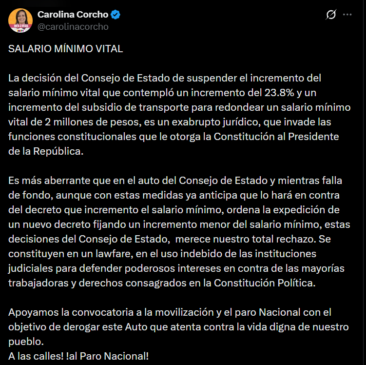 Retomando las reacciones, otra de las personas que se pronunció fue la número uno de la lista al Senado por el Pacto Histórico, Carolina Corcho, quien escribió en su cuenta de X que la decisión de suspender el incremento del Salario Mínimo del 23.8% y un incremento del subsidio de transporte para redondear un salario mínimo vital de 2 millones de pesos, era un “exabrupto jurídico, que invade las funciones constitucionales que le otorga la Constitución al Presidente de la República”.