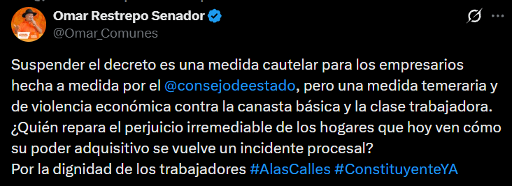 En la misma vía, el senador, Omar Restrepo, del partido Comunes, también escribió sobre el tema que los «amigos de la ley» en el Consejo de Estado cuando les convenía, decían que el aumento del salario vital era un riesgo inflacionario, y que la traducción técnica era que preferían castigar el consumo de las mayorías para proteger la tasa de retorno de las minorías.