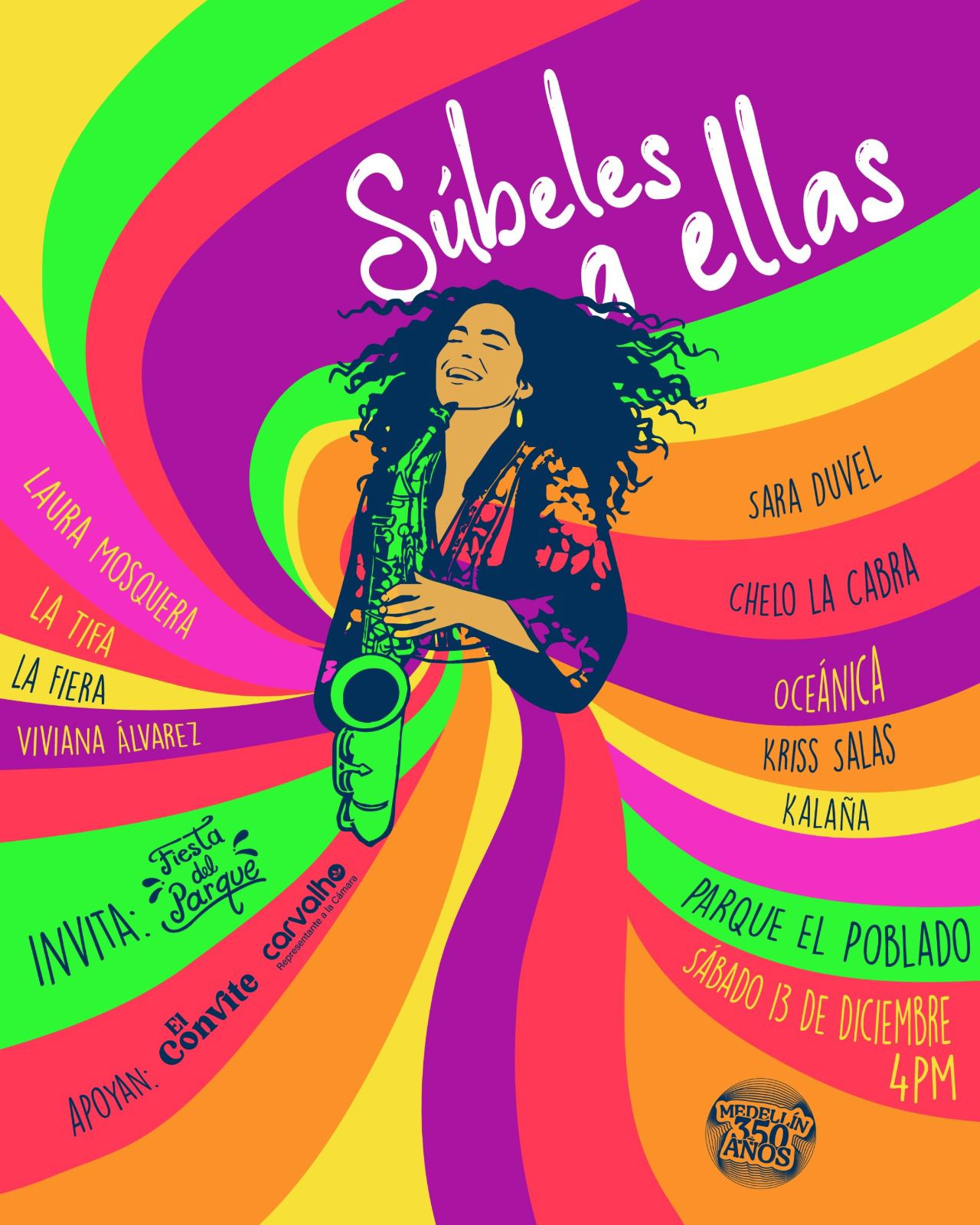 Este sábado 13 de diciembre, el Parque del Poblado será escenario de Súbeles a ellas, una fiesta callejera en la que las mujeres serán las protagonistas. Desde las 4:00 de la tarde, la tarima del parque acogerá una jornada que integrará bienestar, conversación, talleres y conciertos, con participación de mujeres artistas y creadoras, y abierta a quienes quieran disfrutar del talento local en el espacio público.