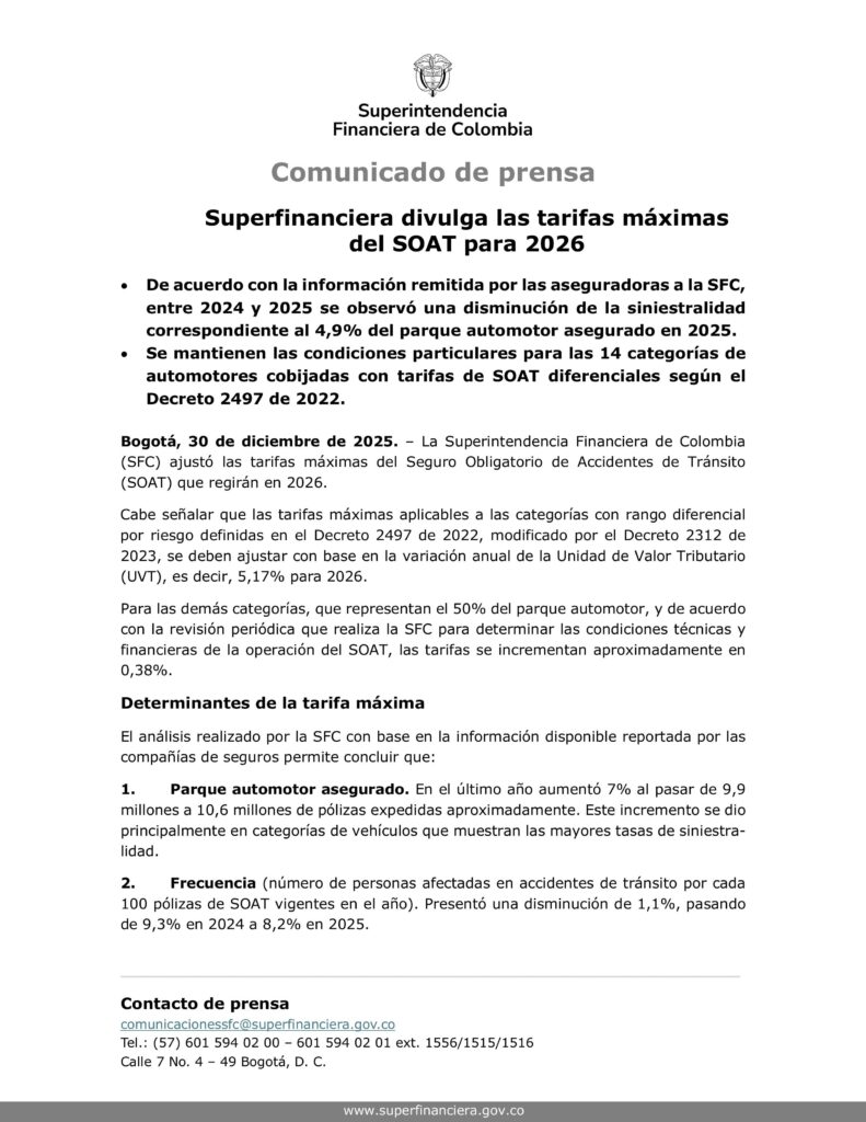 La Superintendencia Financiera de Colombia (SFC) dio a conocer las tarifas máximas del Seguro Obligatorio de Accidentes de Tránsito (SOAT) que estarán vigentes en 2026, tras evidenciar una reducción en la siniestralidad del sistema y una mejora en algunos de sus indicadores técnicos.