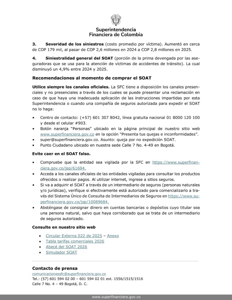 La Superfinanciera reiteró el llamado a los ciudadanos para adquirir el SOAT únicamente a través de canales oficiales. “Utilice siempre los canales oficiales”, señaló la entidad, al tiempo que recordó que dispone de líneas de atención, canales digitales y puntos presenciales para recibir quejas o reclamaciones.
