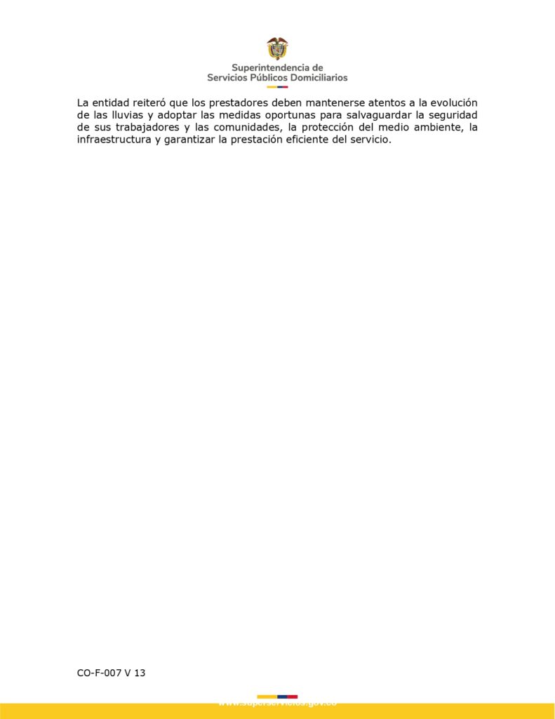 La entidad recordó a los prestadores la obligación de seguir los reportes oficiales sobre la evolución del clima y ajustar sus protocolos internos, además de disponer de recursos técnicos y humanos suficientes para responder a contingencias. El objetivo, según la circular, es proteger a trabajadores, usuarios, infraestructura y entorno ambiental, mientras se garantiza la prestación del servicio.