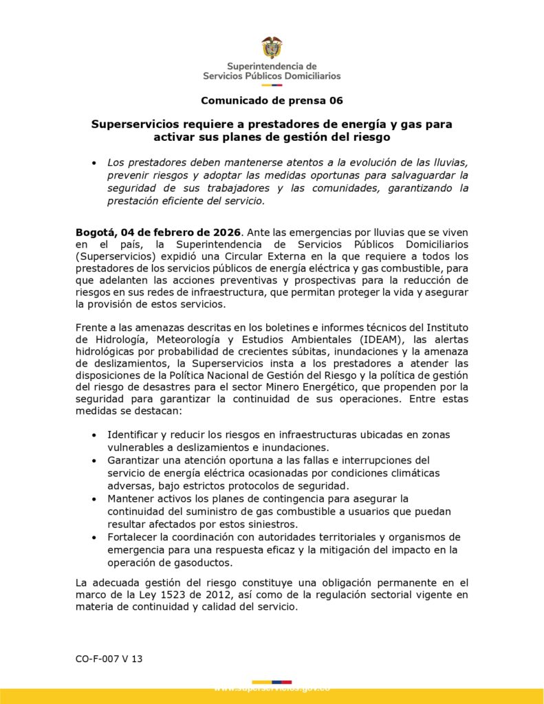 La circular también exige garantizar atención rápida ante fallas o interrupciones ocasionadas por eventos climáticos, bajo protocolos que prioricen la seguridad del personal técnico y de las comunidades ubicadas en zonas de riesgo. En el caso del gas combustible, la entidad ordenó mantener activos los planes de contingencia para asegurar el suministro a usuarios potencialmente afectados por emergencias derivadas de las lluvias.