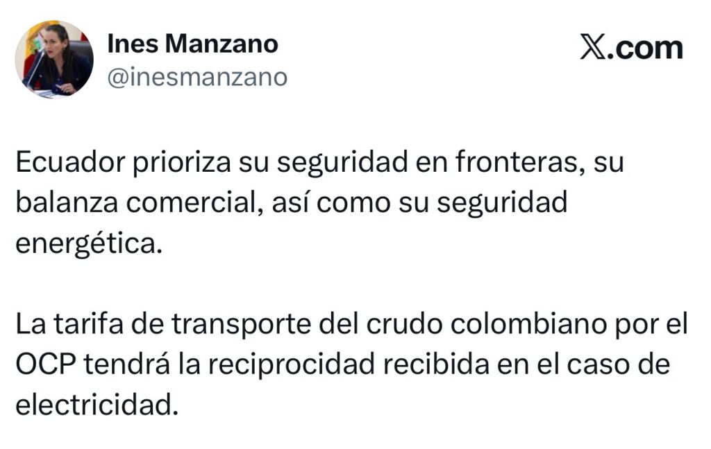 Según explicó la funcionaria en redes sociales, el ajuste en el cobro por el uso del oleoducto responde a las decisiones tomadas por Colombia, entre ellas la imposición de un arancel equivalente a productos ecuatorianos y la suspensión del suministro de electricidad.