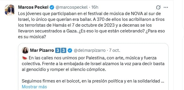 Marcos Peckel, presidente de la Ccjc, publicó un mensaje en su cuenta de X recordando el ataque al festival de música Nova, donde murieron 370 jóvenes a manos de Hamás. “A 370 de ellos los acribillaron a tiros los terroristas de Hamás el 7 de octubre de 2023 y a decenas se los llevaron secuestrados a Gaza. ¿Es eso lo que están celebrando? ¿Para eso es su música?”, escribió el dirigente. En declaraciones a NTN24, Peckel señaló que la fecha debía ser de memoria y no de confrontación política.