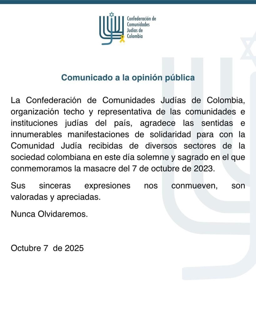 La Confederación de Comunidades Judías también emitió un comunicado de agradecimiento a quienes expresaron su solidaridad con el pueblo judío. En el texto, la organización reafirmó su compromiso con la memoria de las víctimas y rechazó cualquier acto que pudiera interpretarse como apología de la violencia.