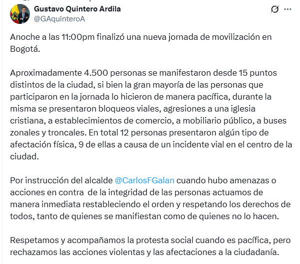 Por su parte, el secretario de Gobierno, Gustavo Quintero, informó que cerca de 4.500 personas participaron en las movilizaciones desde 15 puntos de la ciudad. Confirmó afectaciones a establecimientos comerciales, buses del sistema de transporte y mobiliario público, además de agresiones a una iglesia cristiana. “Respetamos la protesta pacífica, pero rechazamos la violencia y las acciones que ponen en riesgo la integridad de los ciudadanos”, indicó.