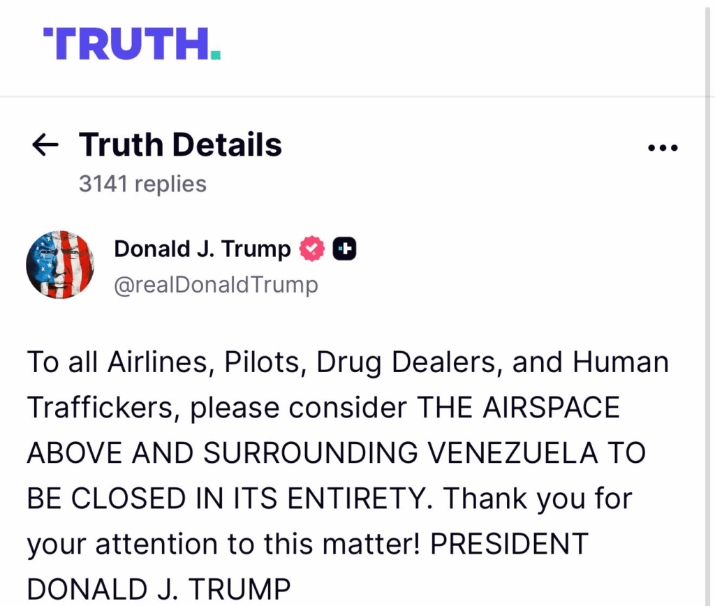 La tensión geopolítica entre Washington y Caracas volvió a escalar este fin de semana después de una advertencia lanzada por el presidente de Estados Unidos, Donald Trump, a través de sus redes sociales. El mensaje, en el que el mandatario pidió un “despeje real del espacio aéreo en Venezuela”, fue interpretado por observadores internacionales como una señal de endurecimiento frente al régimen de Nicolás Maduro. La frase, aunque corta y sin detalles operativos, generó una ola inmediata de reacciones en medios y plataformas digitales.
