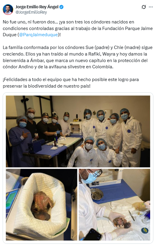 El gobernador de Cundinamarca, a través de su cuenta oficial en X, destacó el trabajo del equipo que ha liderado el proceso de reproducción. “No fue uno, ni fueron dos… ¡ya son tres los cóndores nacidos en condiciones controladas gracias al trabajo de la Fundación Parque Jaime Duque! La familia conformada por Sue y Chie sigue creciendo”, escribió el mandatario.