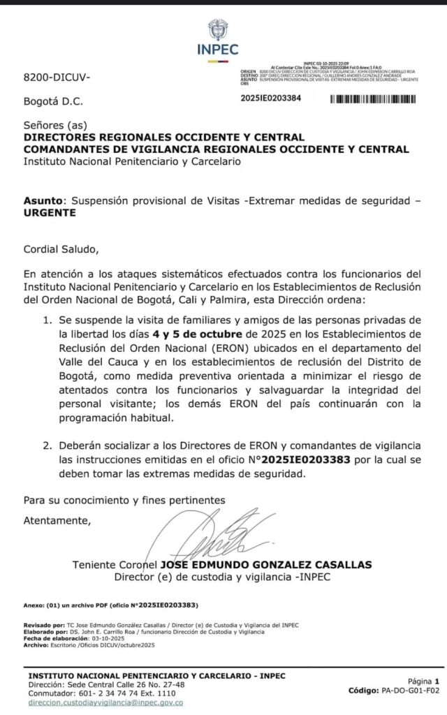 Entre los hechos más recientes figura el asesinato del dragoneante Jimmy Flores Salazar en Cali el pasado 7 de octubre , tras finalizar su turno. Otro ataque grave ocurrió en Bogotá, en la mañana del pasado 2 de octubre, cuando sicarios a bordo de motocicletas dispararon contra guardias en la cárcel La Modelo, causando la muerte de uno y heridas a tres de sus compañeros.