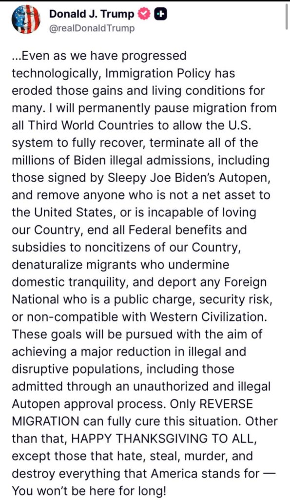 El mandatario informó que pondrá en pausa la migración de países considerados “tercermundistas” hacia Estados Unidos. “Aunque hemos progresado tecnológicamente, la política de inmigración ha erosionado esos logros y las condiciones de vida de muchos. Pausaré permanentemente la migración de todos los países del tercer mundo para permitir que el sistema estadounidense se recupere por completo” aseguró Trump.
