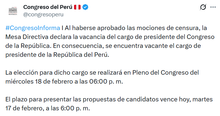 Durante su gestión interina, el ahora exmandatario permaneció en funciones por cerca de cuatro meses. Las investigaciones mencionadas por el Congreso se desarrollaron en paralelo a la preparación del calendario electoral, que contempla comicios generales en los próximos meses. El Legislativo no anunció en la misma sesión el nombre de quien asumirá la conducción del Parlamento ni la sucesión inmediata en la Presidencia encargada.