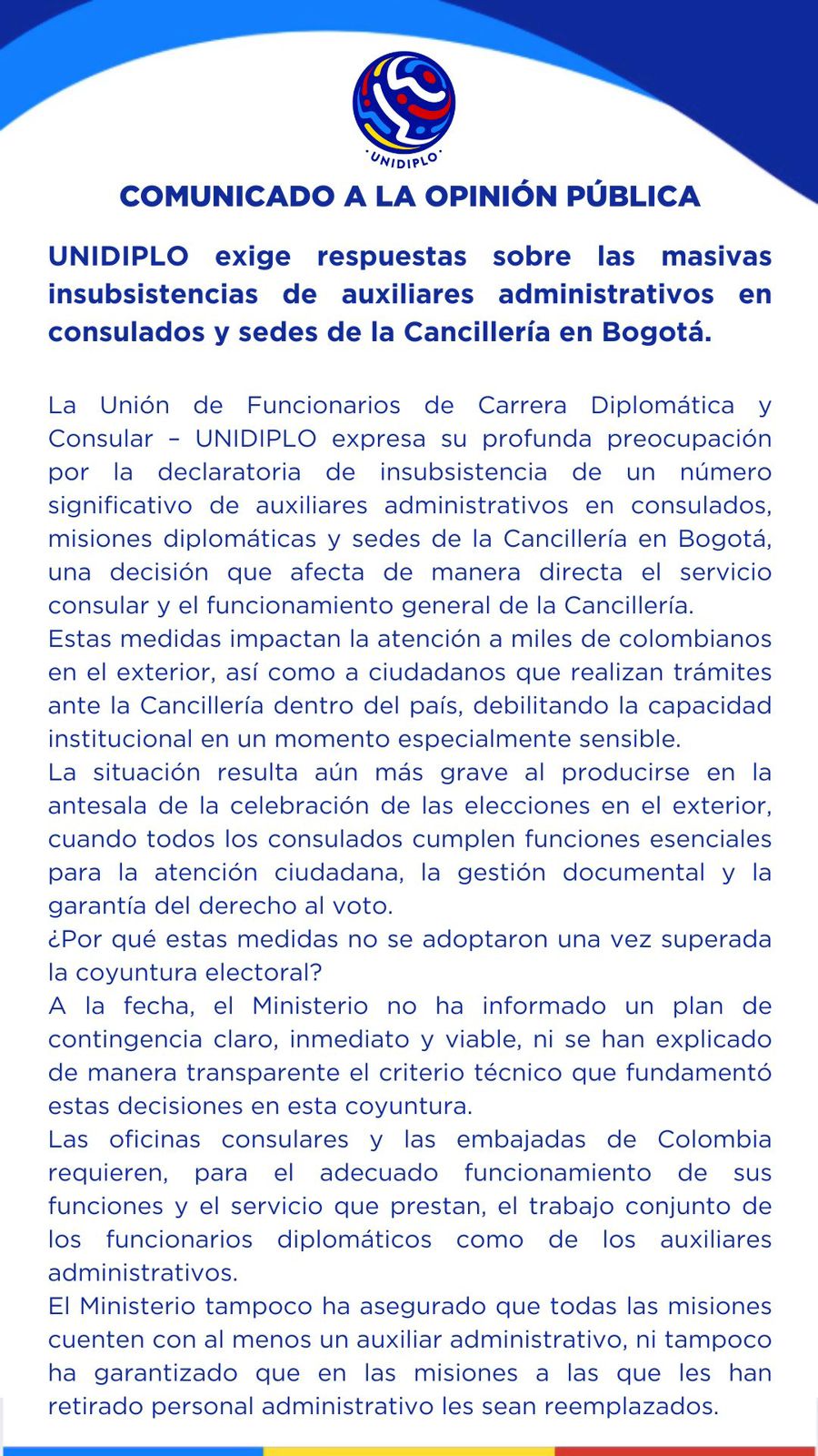 UNIDIPLO concluyó su pronunciamiento reiterando la necesidad de que el Gobierno entregue explicaciones sobre las decisiones adoptadas y sobre los criterios técnicos que las sustentan, en especial por los efectos que estas medidas tienen sobre el servicio consular y la atención a los ciudadanos, tanto en el exterior como en el territorio nacional.