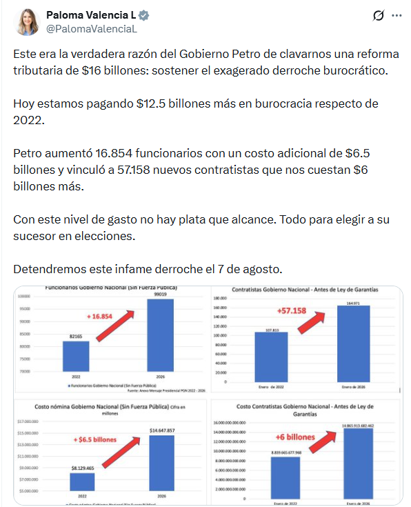 Valencia sostuvo que el aumento en la contratación está relacionado con el crecimiento del gasto en burocracia frente a 2022. En sus publicaciones afirmó que el Gobierno incrementó en 16.854 el número de funcionarios, con un costo adicional estimado en $6,5 billones, y vinculó 57.158 nuevos contratistas por cerca de $6 billones adicionales.