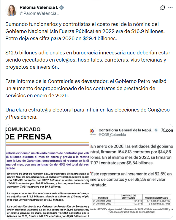 La senadora y precandidata presidencial Paloma Valencia publicó una serie de mensajes en su cuenta de X en los que se refirió al crecimiento de la nómina y de la contratación por prestación de servicios del Gobierno Nacional, citando cifras atribuidas a un informe de la Contraloría General de la República.