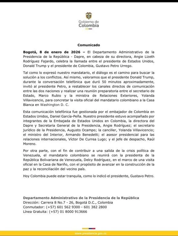 La aclaración del gobierno venezolano se produce luego de que, desde la Presidencia de la República de Colombia, se divulgara un comunicado oficial en el que se señalaba que Rodríguez visitaría Bogotá para reunirse con el presidente Gustavo Petro en la Casa de Nariño. Según ese documento, el encuentro tendría lugar en el marco de una visita oficial y estaría orientado a avanzar en asuntos relacionados con la situación interna del país vecino.