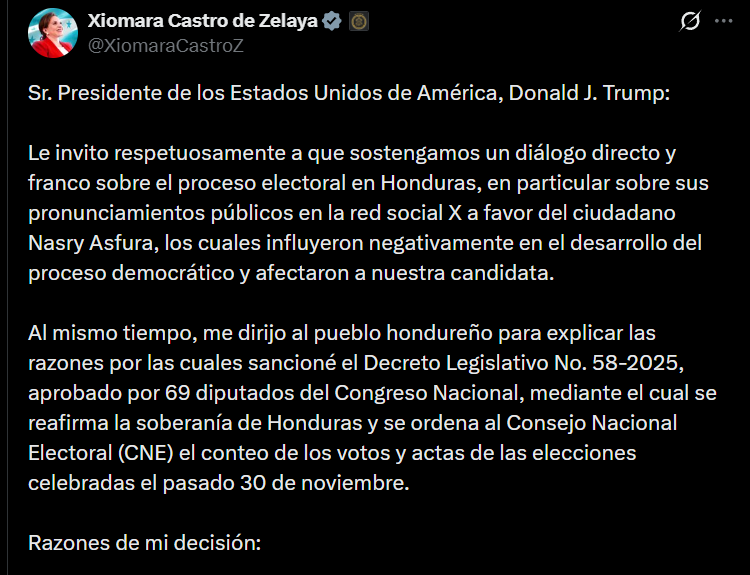 En ese mensaje, la mandataria solicitó un diálogo directo y franco con el mandatario estadounidense y señaló que sus pronunciamientos públicos en favor de Asfura, realizados antes de las elecciones, influyeron negativamente en el desarrollo del proceso democrático afectando a la candidata oficialista, Rixi Moncada.